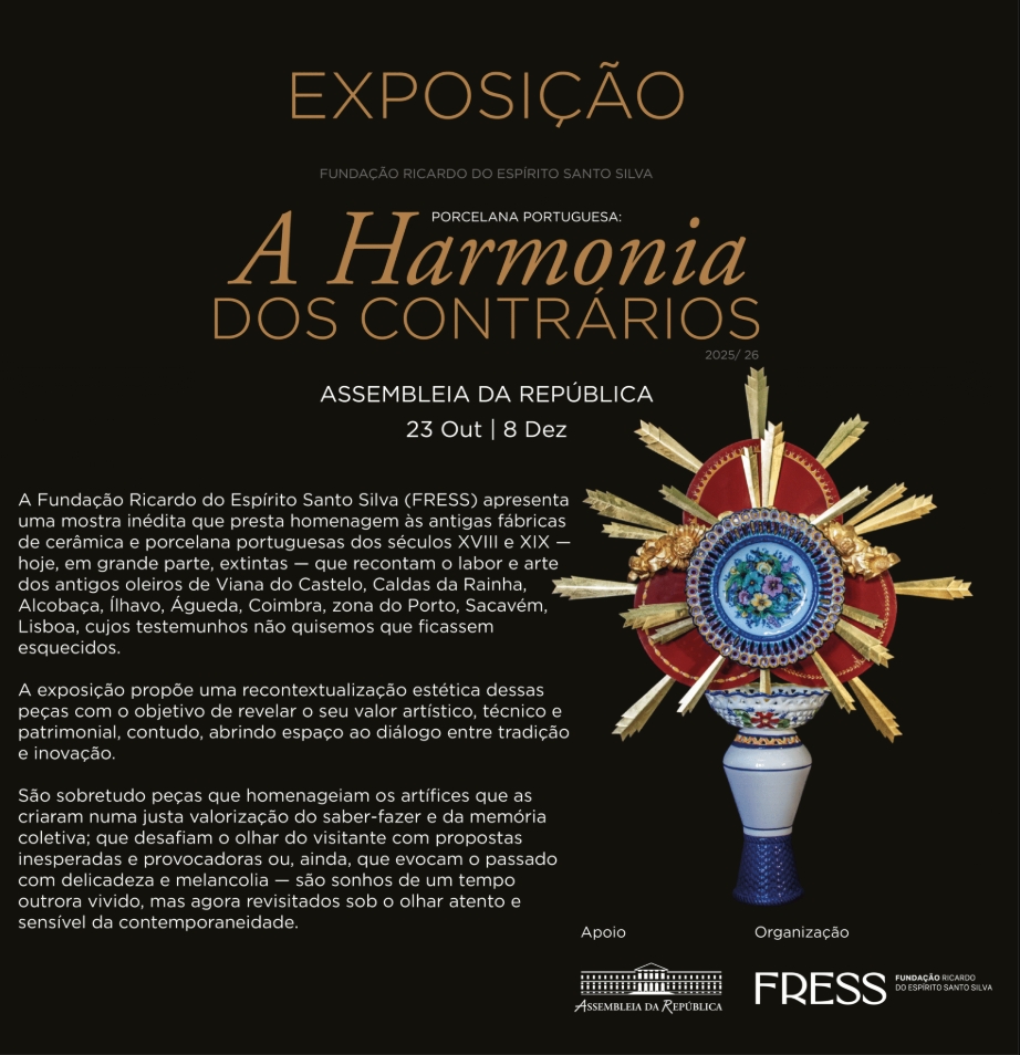 A Fundação Ricardo do Espírito Santo Silva (FRESS) apresenta uma mostra inédita que presta homenagem às antigas fábricas de cerâmica e porcelana portuguesas dos séculos XVIII e XIX – hoje, em grande parte, extintas – que recontam o labor e arte dos antigos oleiros de Viana do Castelo, Caldas da Rainha, Alcobaça, Ílhavo, Águeda, Coimbra, zona do Porto, Sacavém, Lisboa, cujos testemunhos não quisemos que ficassem esquecidos.