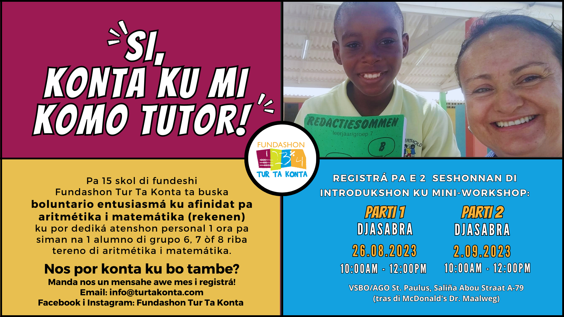 Den parti 1 di e workshop fasinante di aritmétika i matemátika di Fundashon Tur Ta Konta titulá ‘Suma i Deskontá’ ('Optellen en Aftrekken') ku atenshon spesial pa 'suma', un grupo di boluntario ta prepará pa bira tutor di aritmétika i matemátika den enseñansa di fundeshi pa grupo 6, 7, i 8. E workshop ta kombiná abilidat tradishonal di kontamentu ku aserkamentu edukativo moderno i abilidat di siglo 21 pa prepará boluntario efektivamente pa nan ròl komo tutor di aritmétika i matemátika.